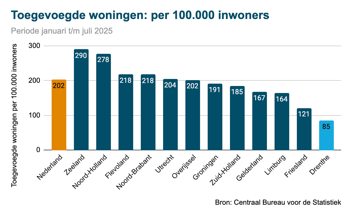 In Drenthe ligt deze toename maar liefst 58% lager dan gemiddeld in Nederland. Zo kwamen er in Drenthe per 100.000 inwoners 85 woningen bij, terwijl er over heel Nederland gezien 202 woningen per 100.000 inwoners bij kwamen. Hiermee is de toename per inwoner de kleinste van Nederland.