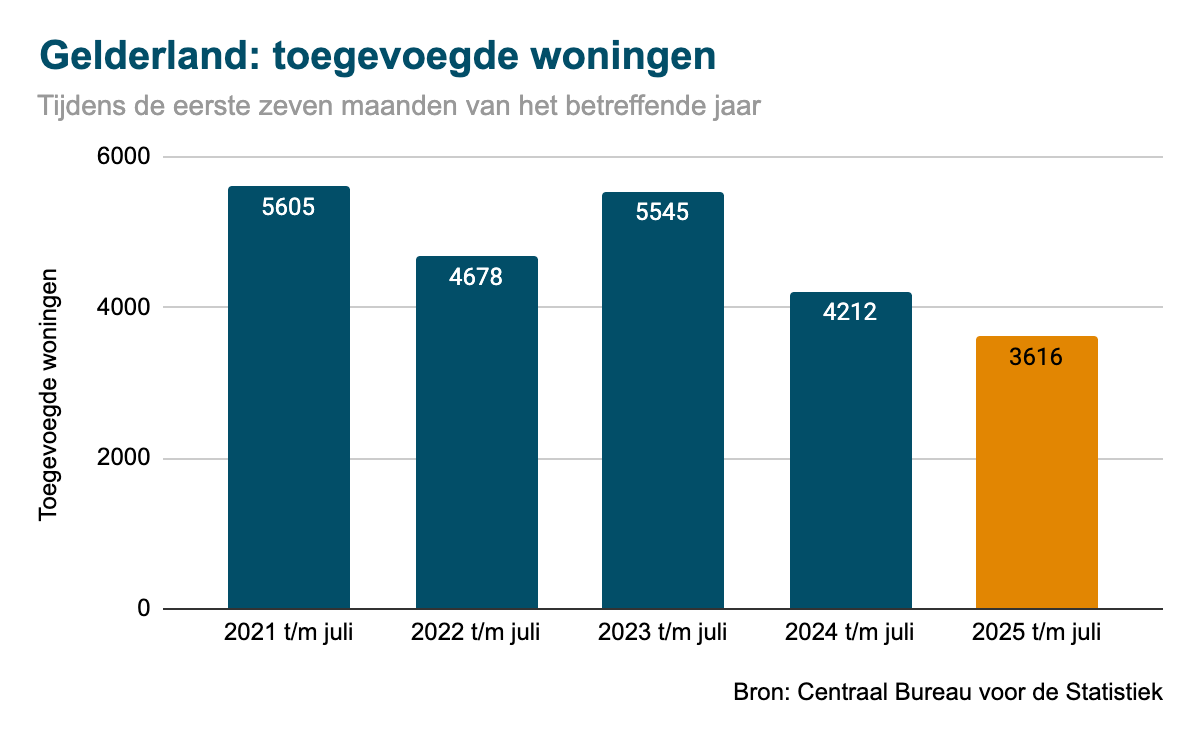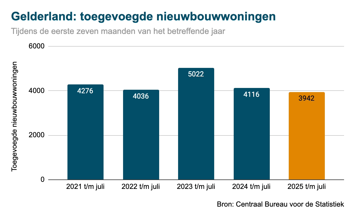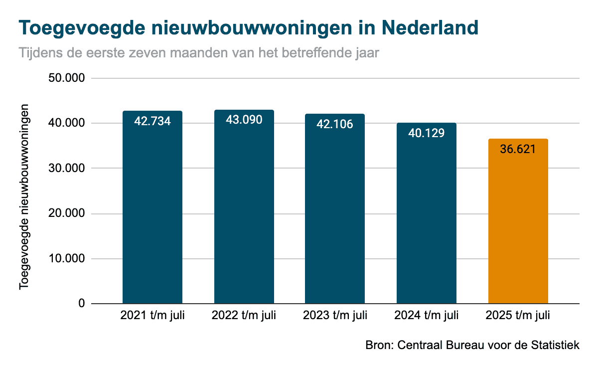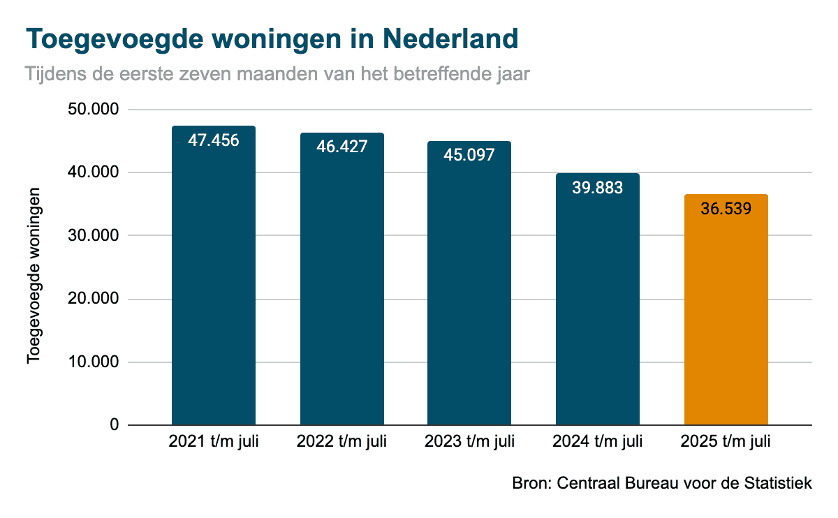 Het aantal toegevoegde nieuwbouwwoningen daalt inmiddels al drie jaar op rij. Vergeleken met drie jaar geleden (43.090 in 2022) ligt het aantal toegevoegde nieuwbouwwoningen nu zelfs 15% lager.