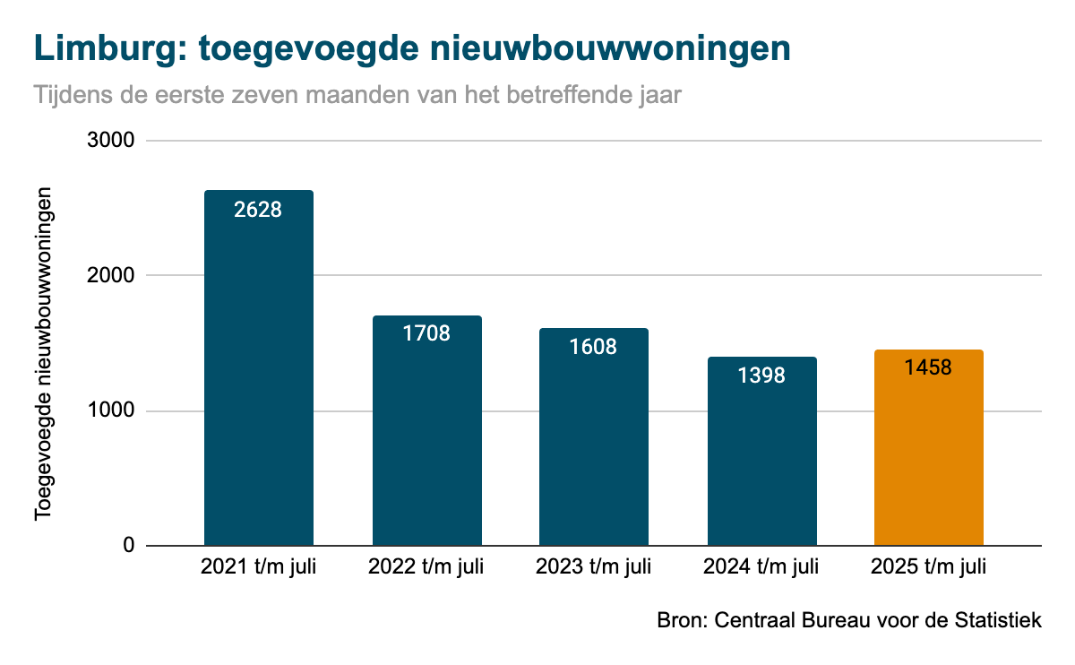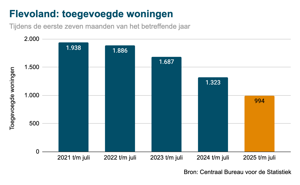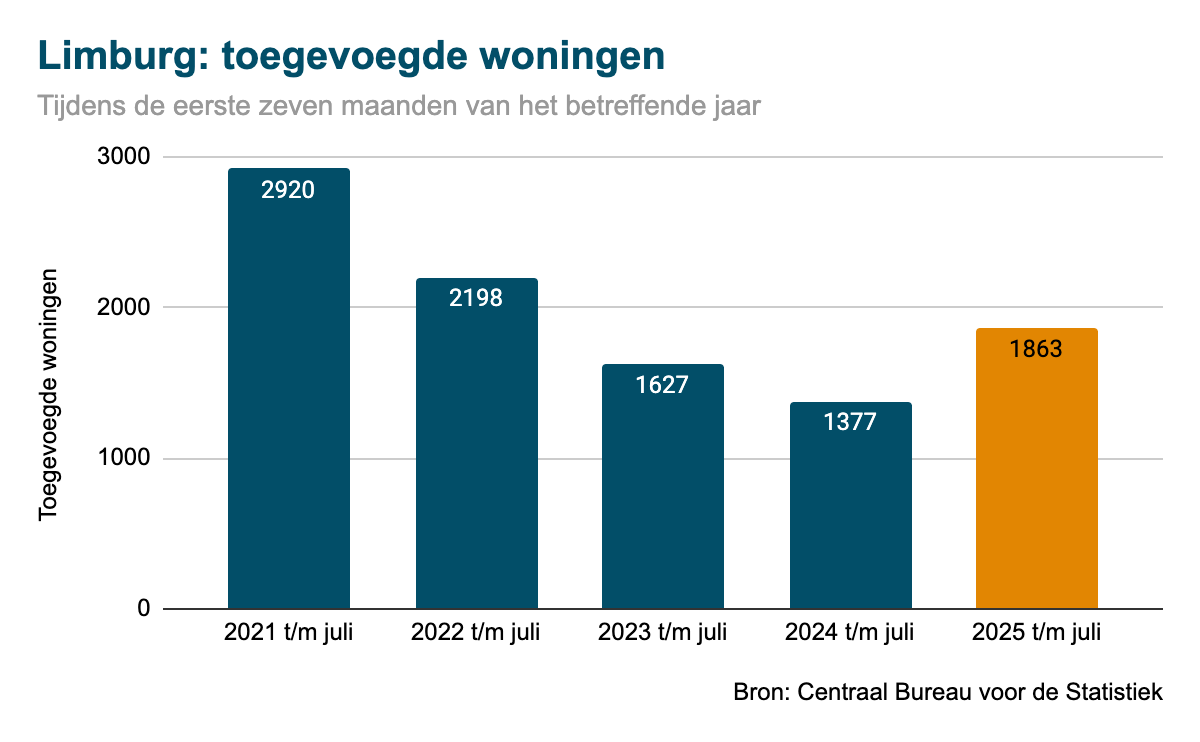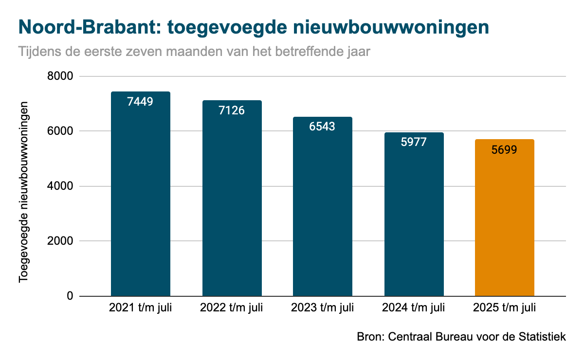 Het aantal toegevoegde nieuwbouwwoningen daalt inmiddels al drie jaar op rij. Vergeleken met drie jaar geleden (43.090 in 2022) ligt het aantal toegevoegde nieuwbouwwoningen nu zelfs 15% lager.