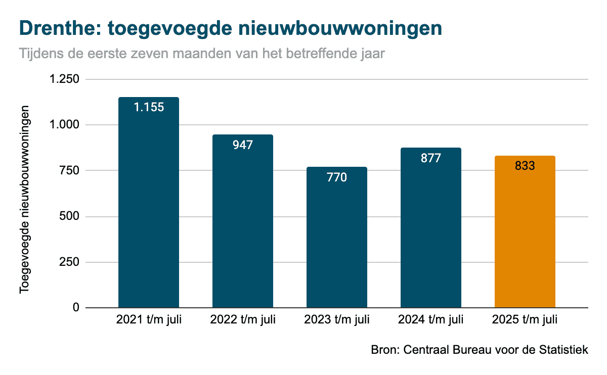 Zoals gebruikelijk in Nederland is de toename van de woningvoorraad in Drenthe vooral te danken aan het aantal toegevoegde nieuwbouwwoningen. Tijdens de eerste zeven maanden van 2025 zijn er 833 nieuwbouwwoningen aan de voorraad toegevoegd. Dit is een daling van 5% ten opzichte van 2024, toen er in dezelfde periode nog 877 nieuwbouwwoningen aan de woningvoorraad waren toegevoegd.