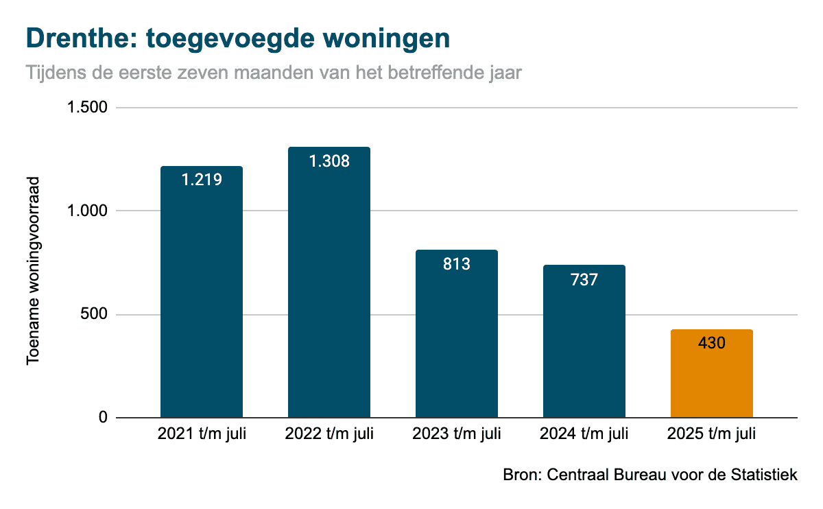 In Drenthe zijn er in 2025 tot en met de maand juli 430 woningen aan de woningvoorraad toegevoegd. De woningvoorraad steeg daarmee met 0,19% van 230.307 woningen op 1 januari naar 230.737 woningen op 31 juli. Dit is een daling van 42% ten opzichte van 2024, toen er in dezelfde periode nog 737 woningen aan de woningvoorraad waren toegevoegd.