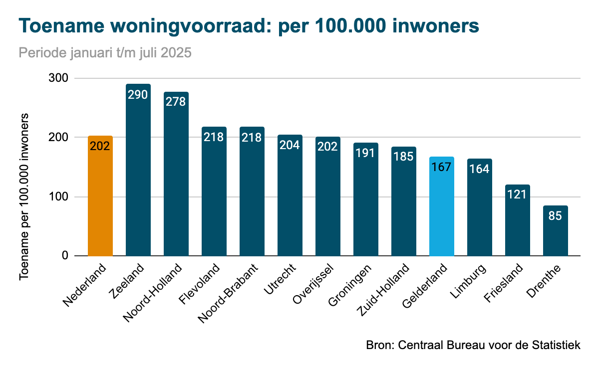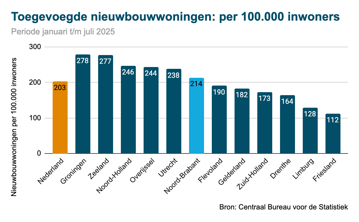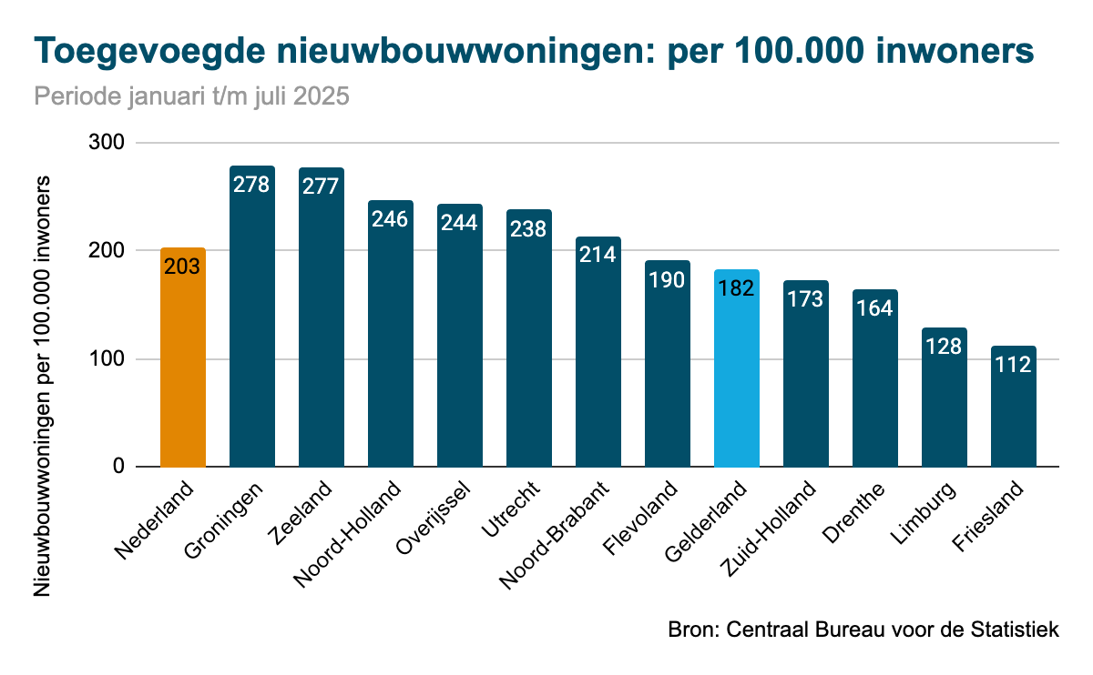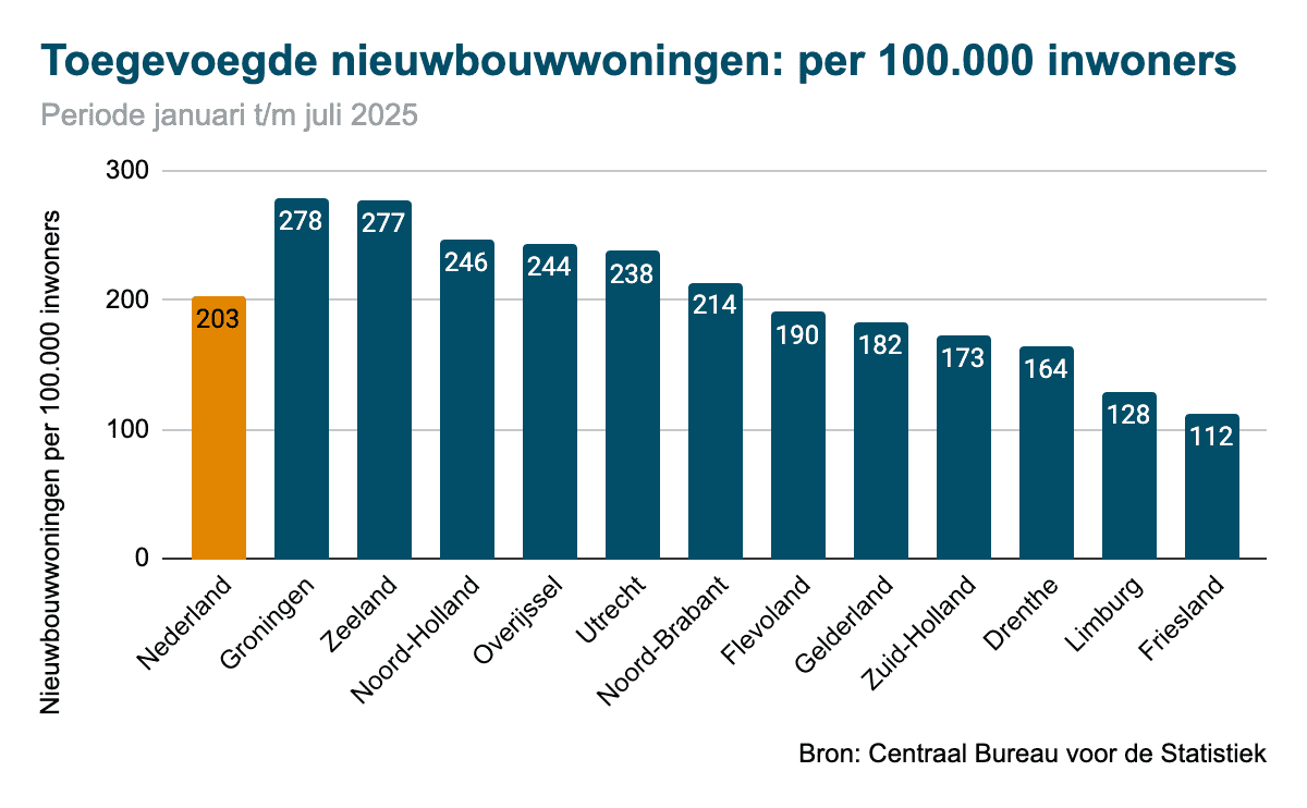 Er kwamen in 2025 tot en met juli gemiddeld 203 nieuwbouwwoningen per 100.000 inwoners bij. Dit aantal loopt tussen de verschillende provincies echter behoorlijk uiteen.