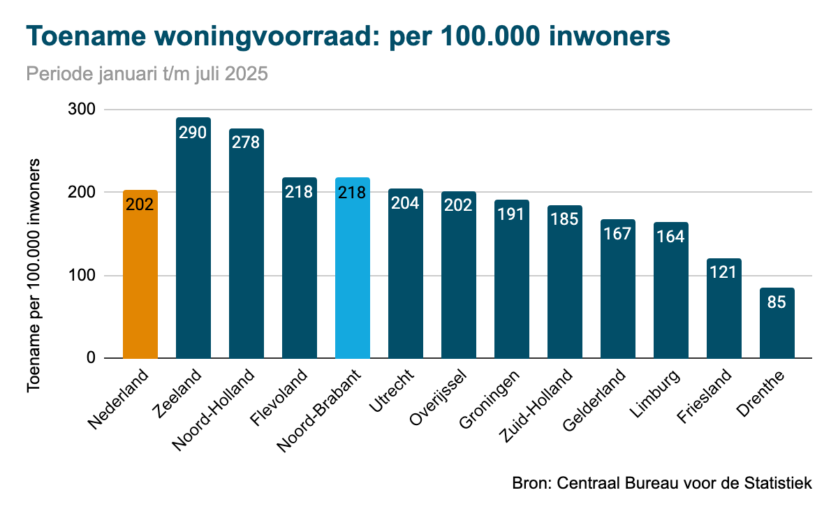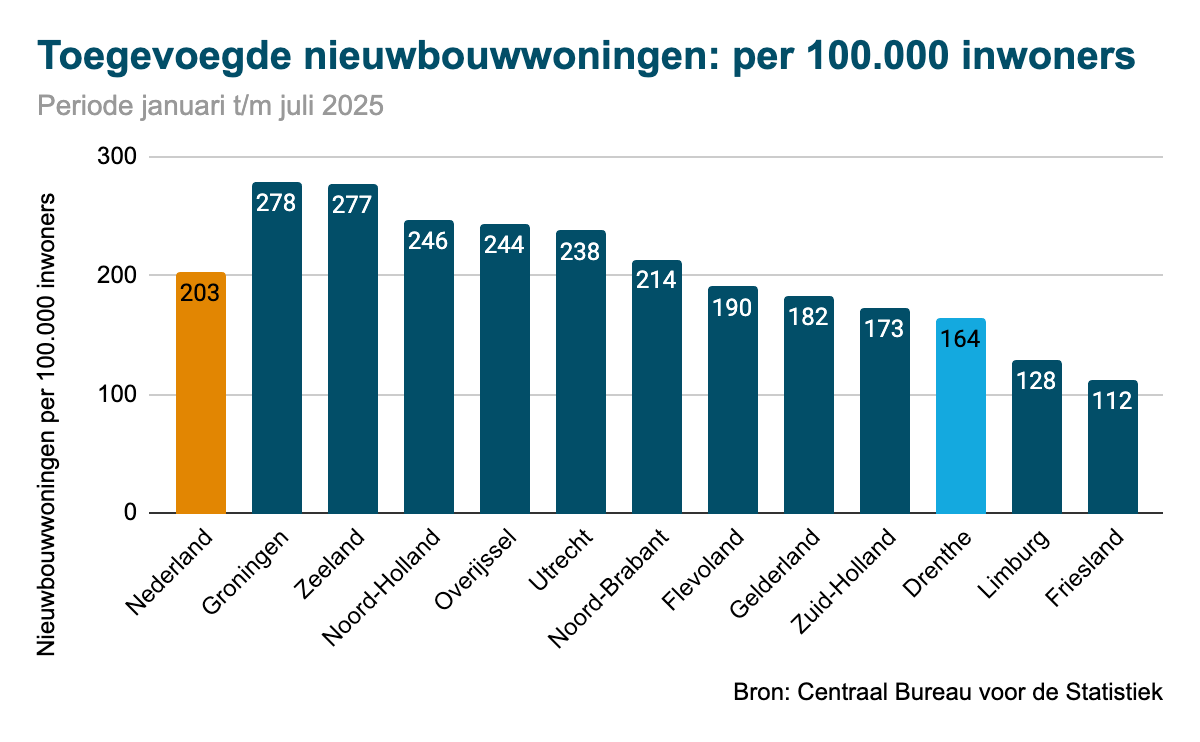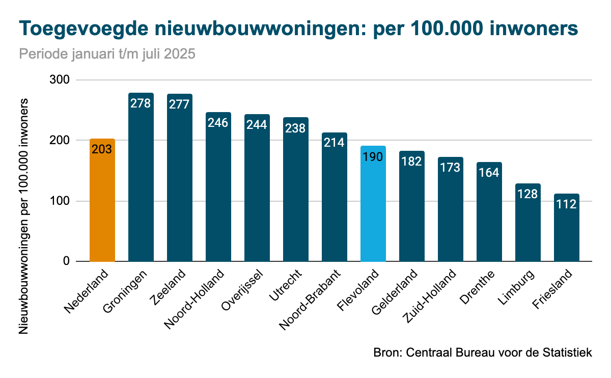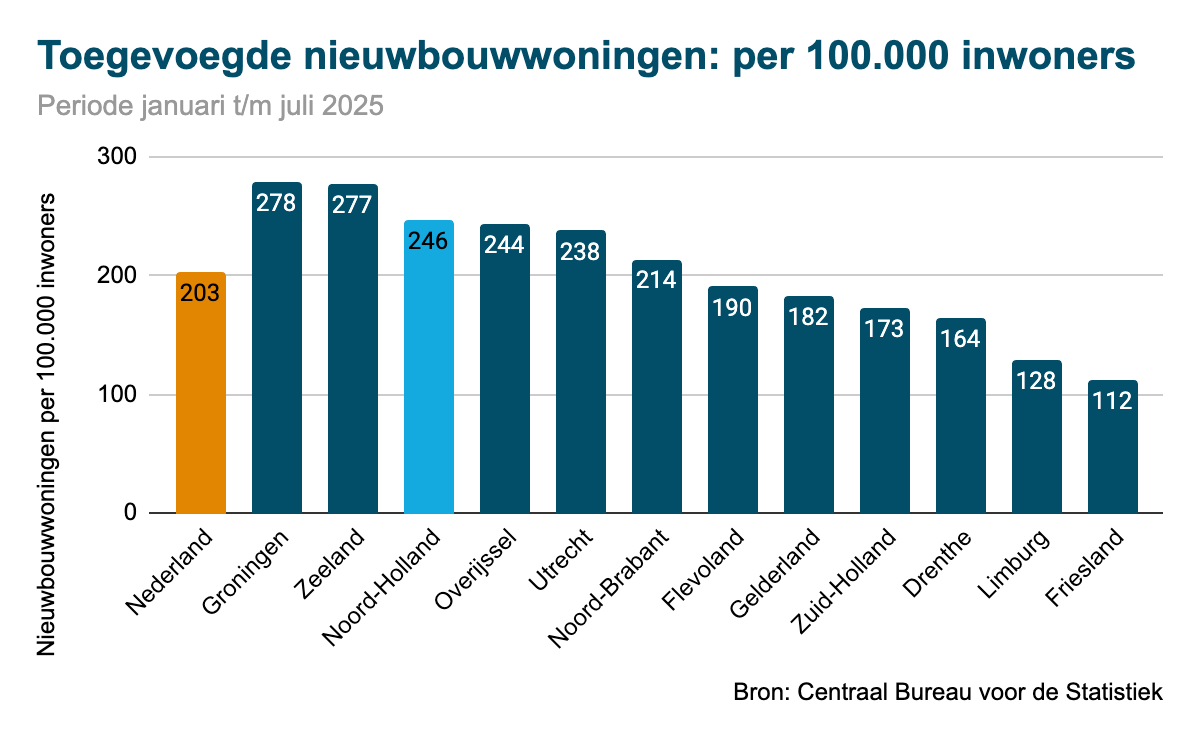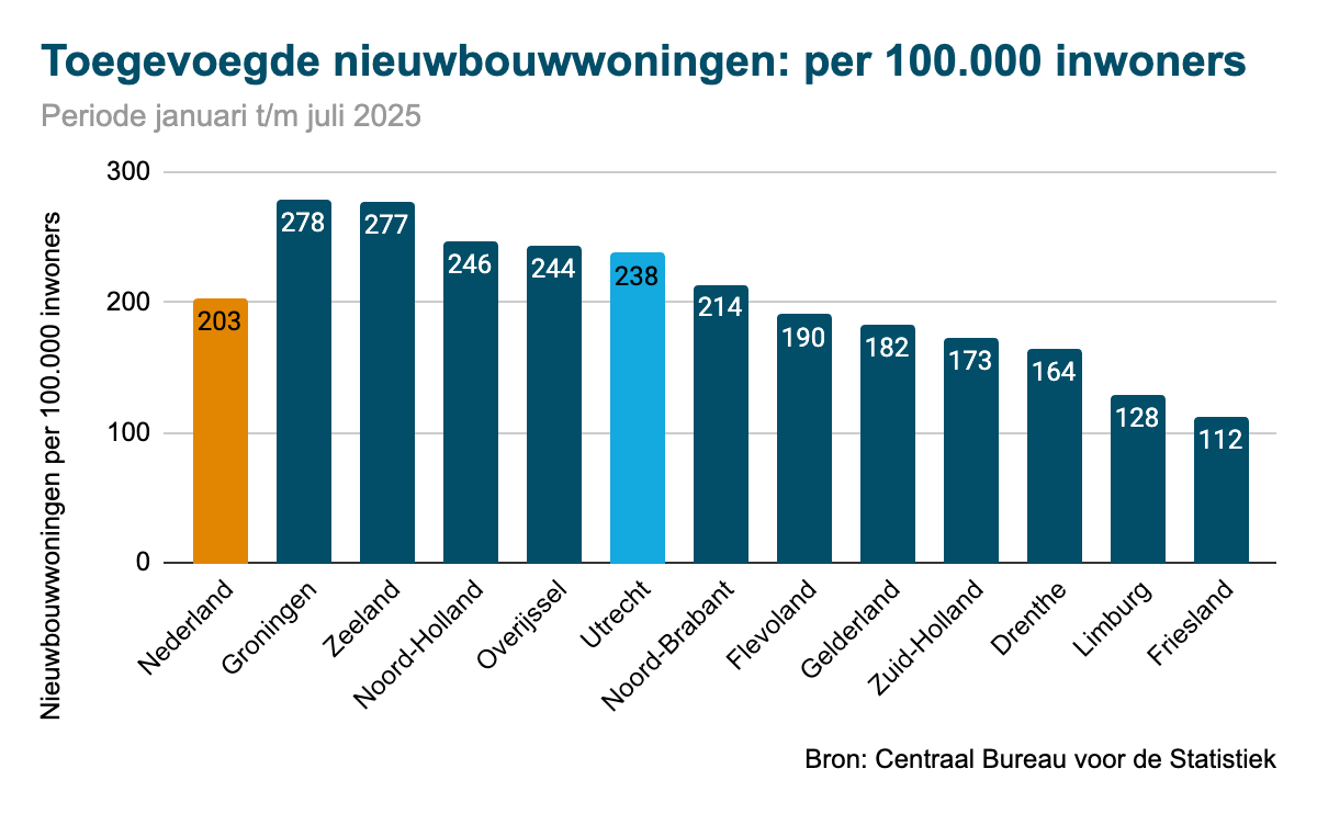 Er kwamen in 2025 tot en met juli gemiddeld 203 nieuwbouwwoningen per 100.000 inwoners bij. Dit aantal loopt tussen de verschillende provincies echter behoorlijk uiteen.