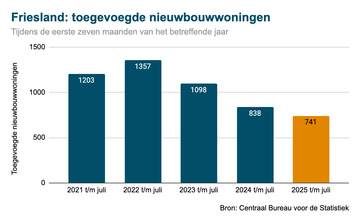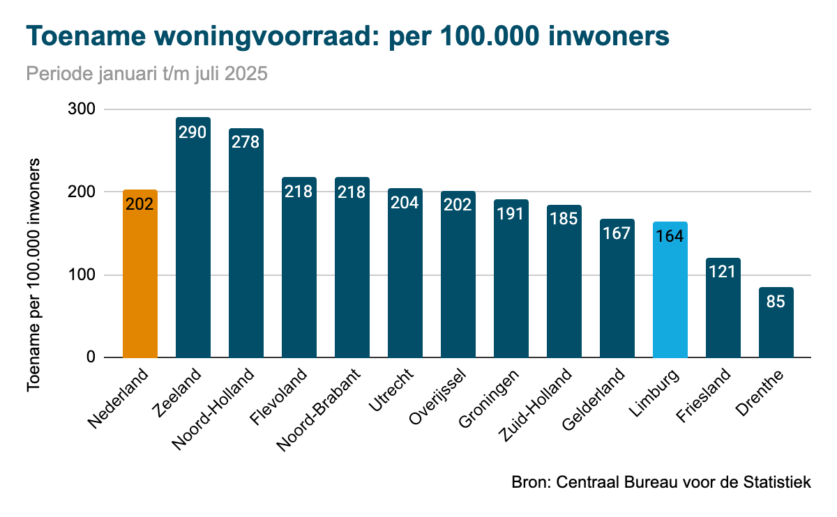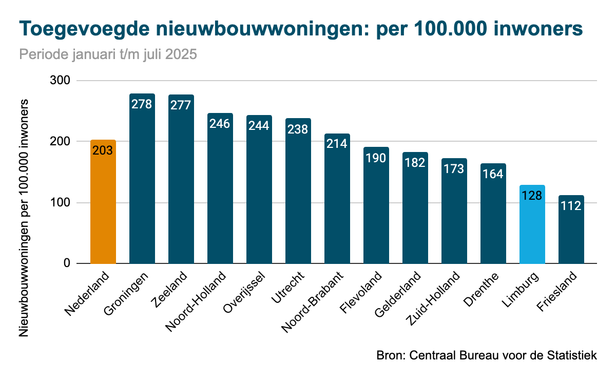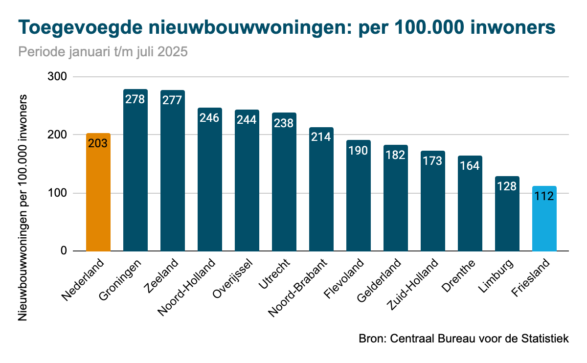In Friesland is het aantal toegevoegde nieuwbouwwoningen het laagst: met 112 per 100.000 inwoners ligt dit 45% onder het landelijke gemiddelde. Ook in Limburg bleef het aantal toegevoegde nieuwbouwwoningen fors achter: met 128 per 100.000 inwoners ligt dit 37% lager dan gemiddeld in Nederland.