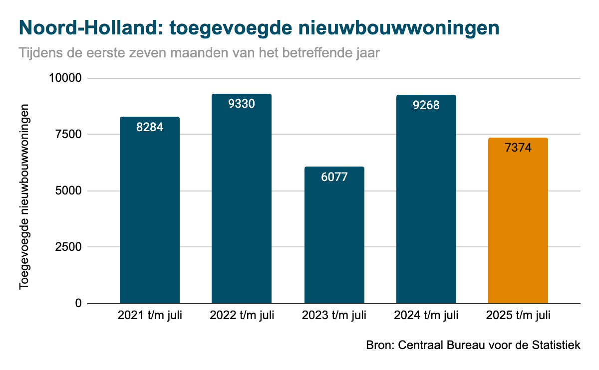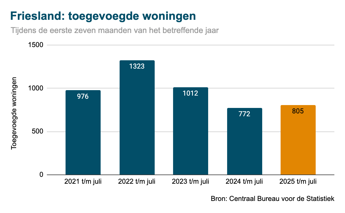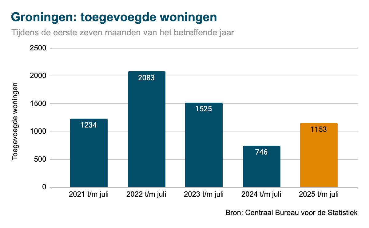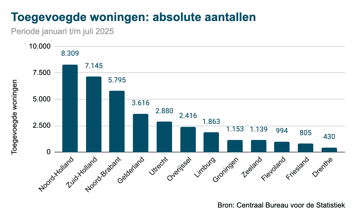 In 2025 zijn er tot en met de maand juli in Nederland 36.539 woningen aan de woningvoorraad toegevoegd. De woningvoorraad stijgt daarmee met 0,44% van 8.274.511 woningen op 1 januari naar 8.311.050 woningen op 31 juli 2025. Dit is een daling van 8% ten opzichte van 2024, toen er in dezelfde periode nog 39.883 woningen aan de woningvoorraad waren toegevoegd.