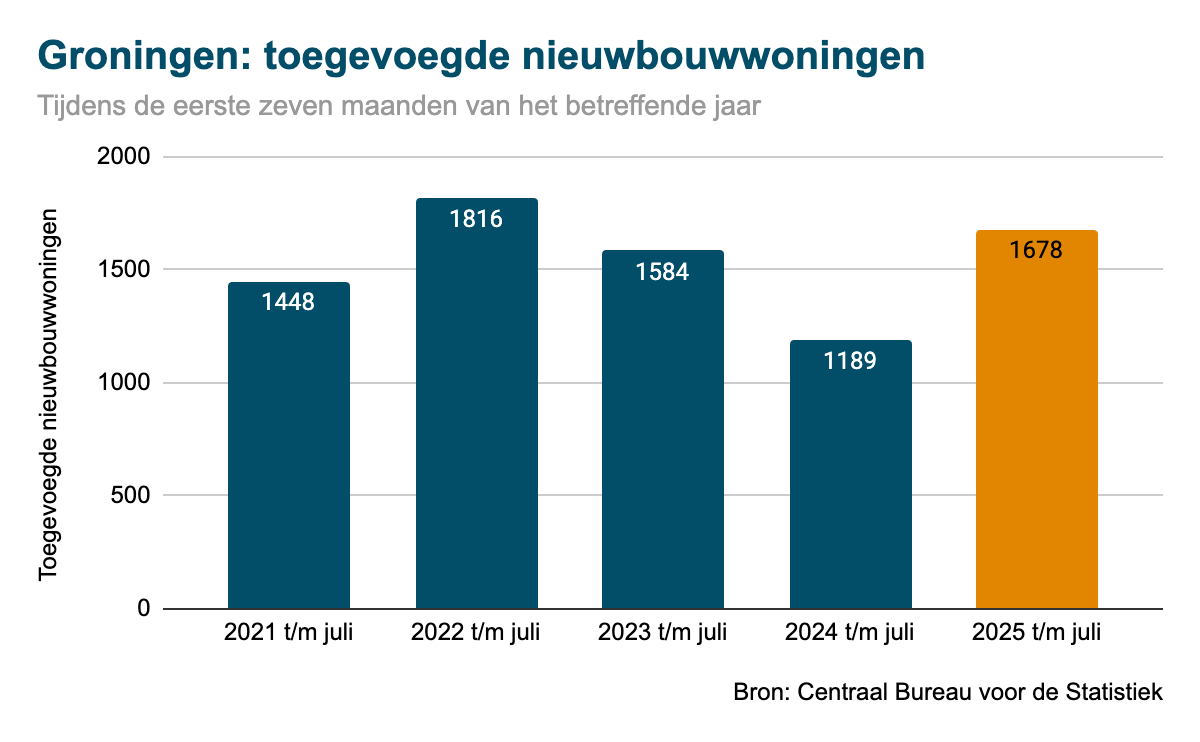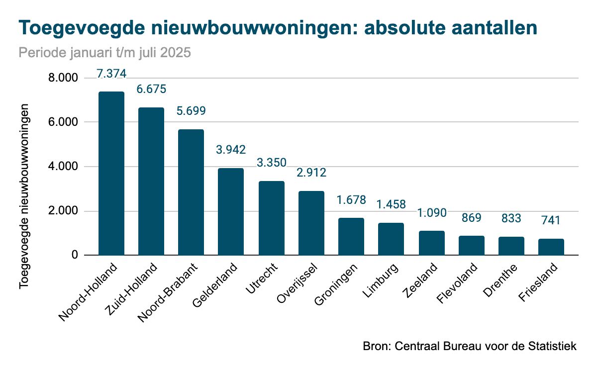 Zoals gebruikelijk in Nederland is de woningvoorraad met name toegenomen door toegevoegde nieuwbouwwoningen. Tijdens de eerste zeven maanden van 2025 zijn er 36.621 nieuwbouwwoningen aan de voorraad toegevoegd. Dit is een daling van 9% ten opzichte van 2024, toen er in dezelfde periode nog 40.129 nieuwbouwwoningen aan de woningvoorraad waren toegevoegd.