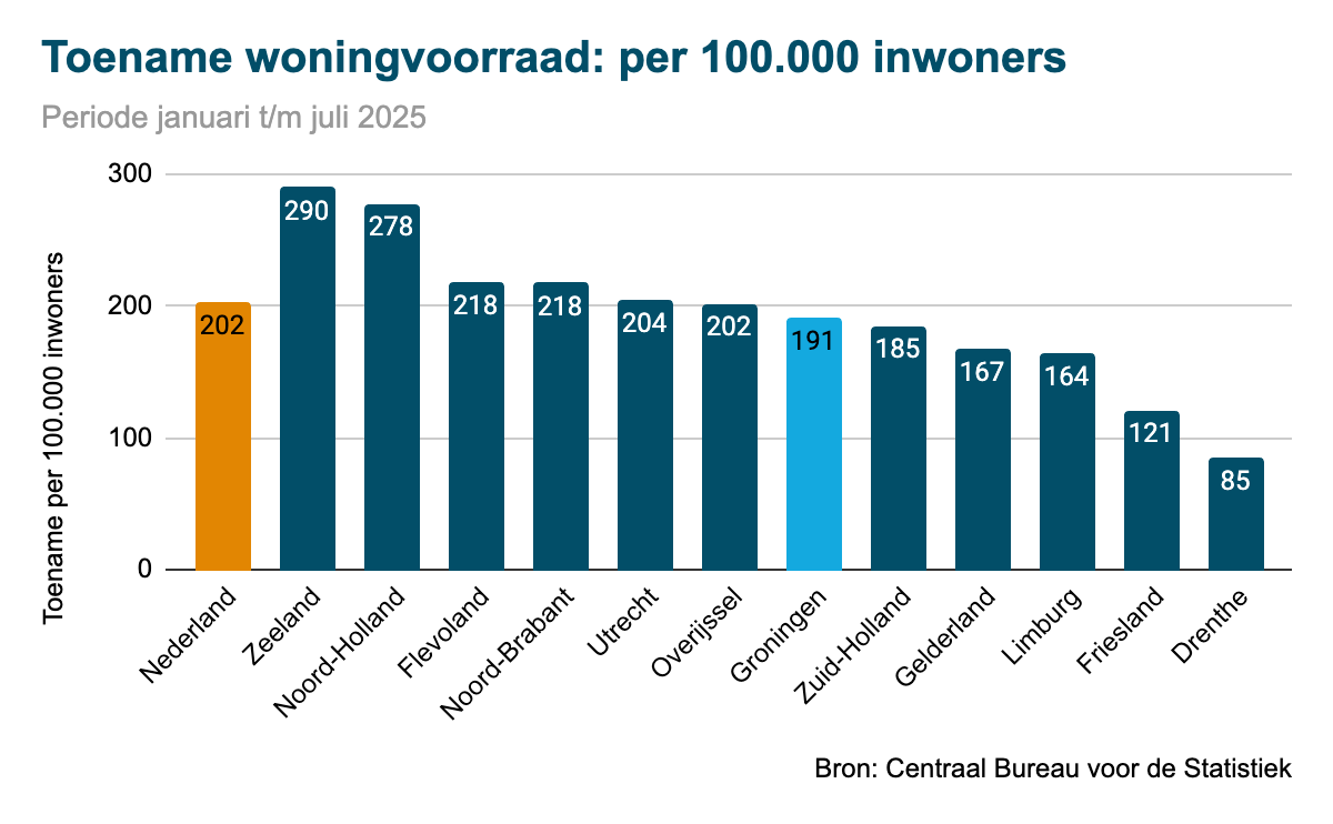 Zo ligt het aantal toegevoegde nieuwbouwwoningen in Groningen met 278 per 100.000 inwoners 37% hoger dan gemiddeld. Ook in Zeeland ligt het aantal toegevoegde nieuwbouwwoningen met 277 per 100.000 inwoners 36% hoger dan gemiddeld.