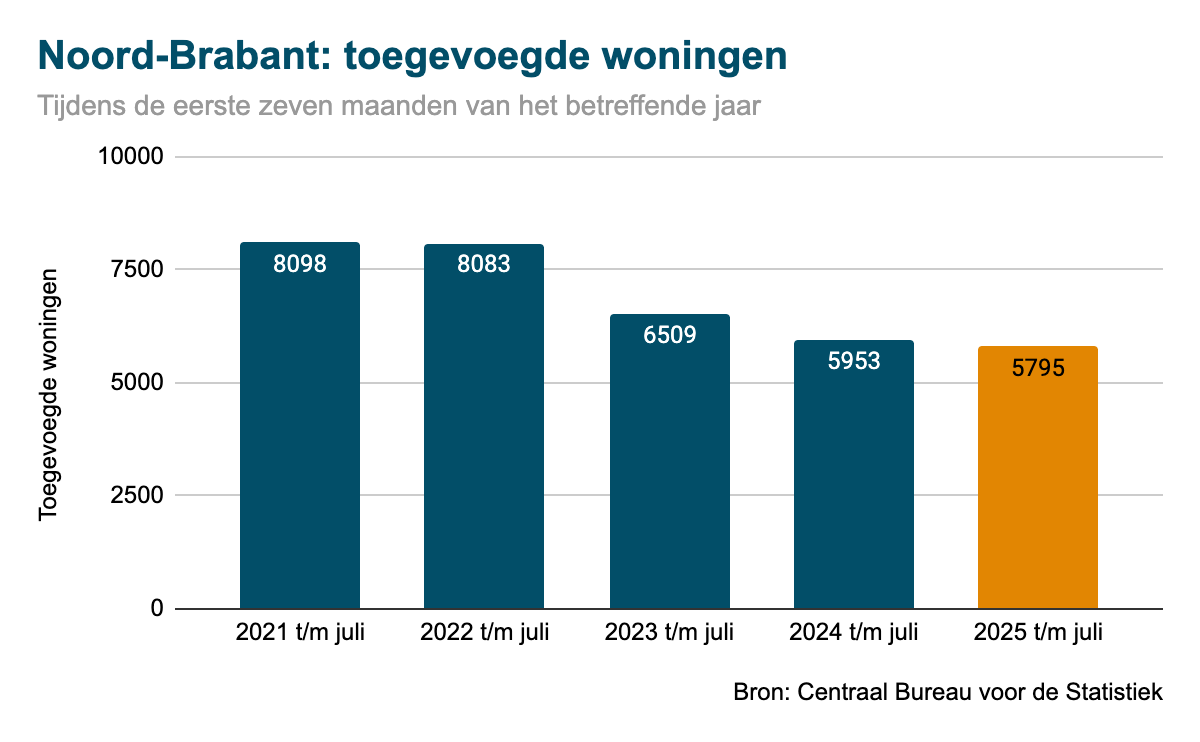 Het aantal toegevoegde woningen was in vijf jaar tijd nog nooit zo klein en daalt inmiddels voor het tweede jaar op rij. Vergeleken met de piek (11.892 woningen in 2023) ligt het aantal toegevoegde woningen nu zelfs 40% lager.