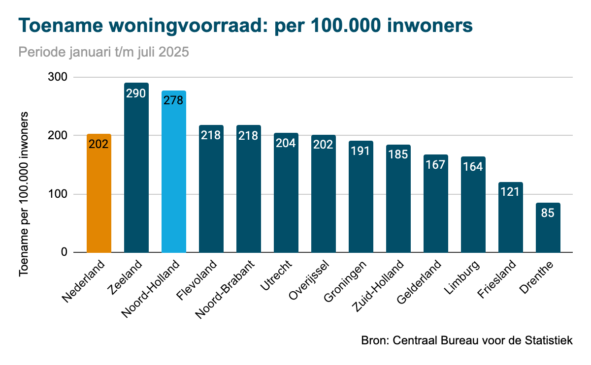 Zo nam de voorraad in Zeeland met 290 woningen per 100.000 inwoners 44% meer toe dan gemiddeld. In Noord-Holland nam de voorraad met 278 woningen per 100.000 inwoners 38% meer toe dan gemiddeld.