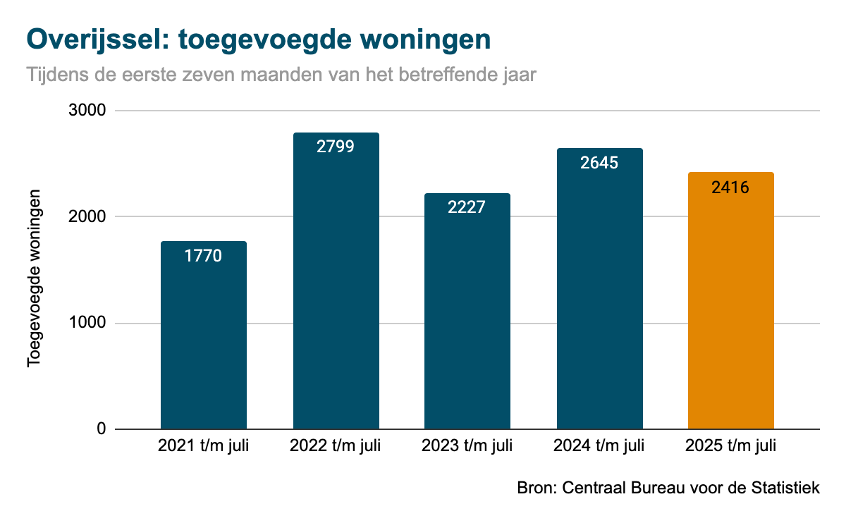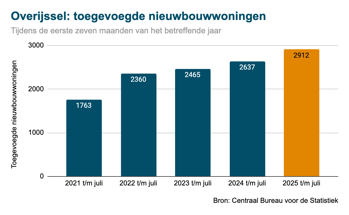 Zoals gebruikelijk in Nederland is de toename van de woningvoorraad in Overijssel vooral te danken aan het aantal toegevoegde nieuwbouwwoningen. In de eerste zeven maanden van 2025 zijn er 2.912 nieuwbouwwoningen aan de voorraad toegevoegd. Dit is een stijging van 10% ten opzichte van 2024, toen er in dezelfde periode slechts 2.637 nieuwbouwwoningen aan de woningvoorraad waren toegevoegd.