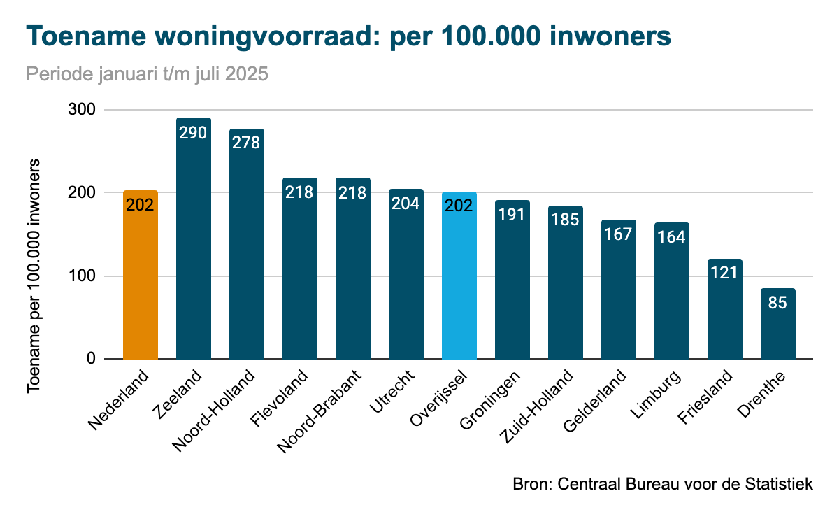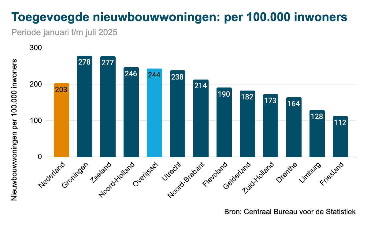 Het aantal nieuwbouwwoningen dat er in Overijssel aan de woningvoorraad is toegevoegd, ligt met 244 nieuwbouwwoningen per 100.000 inwoners 20% hoger dan gemiddeld in Nederland. Alleen in de provincies Noord-Holland, Zeeland en Groningen zijn er meer nieuwbouwwoningen per 100.000 inwoners aan de woningvoorraad toegevoegd.
