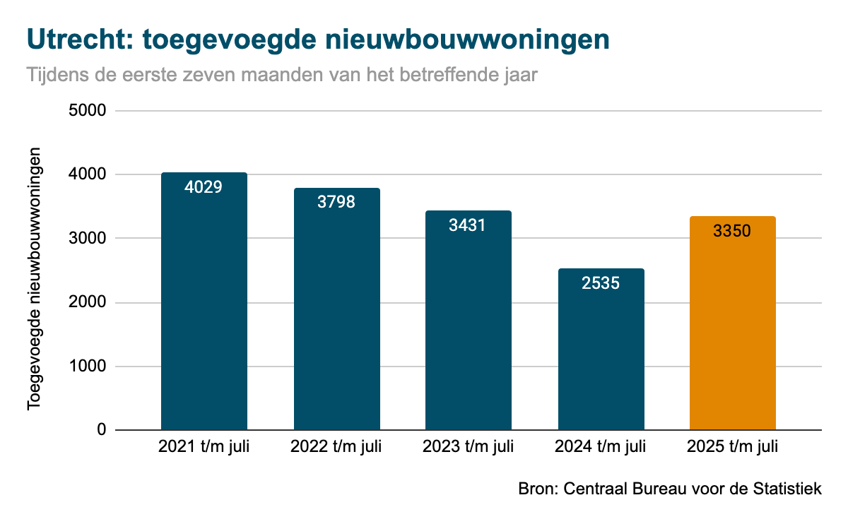 Zoals gebruikelijk in Nederland is de toename van de woningvoorraad in Utrecht vooral te danken aan het aantal toegevoegde nieuwbouwwoningen. In de eerste zeven maanden van 2025 zijn er 3.350 nieuwbouwwoningen aan de voorraad toegevoegd. Dit is een stijging van 32% ten opzichte van 2024, toen er in dezelfde periode slechts 2.535 nieuwbouwwoningen aan de woningvoorraad waren toegevoegd.