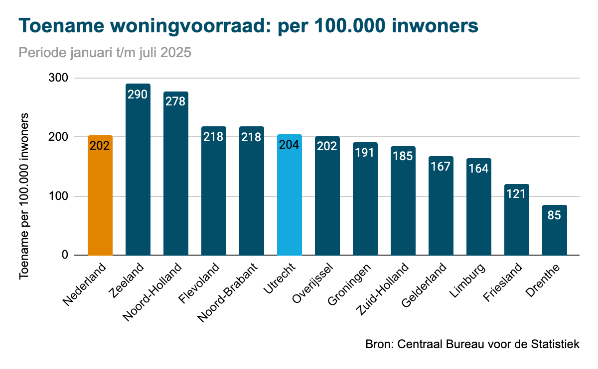 In Utrecht ligt deze toename 1% hoger dan gemiddeld in Nederland. Zo kwamen er in Utrecht per 100.000 inwoners 204 woningen bij, terwijl er over heel Nederland gezien 202 woningen per 100.000 inwoners bij kwamen. Alleen in de provincies Noord-Brabant, Flevoland, Noord-Holland en Zeeland is de toename per inwoner groter.