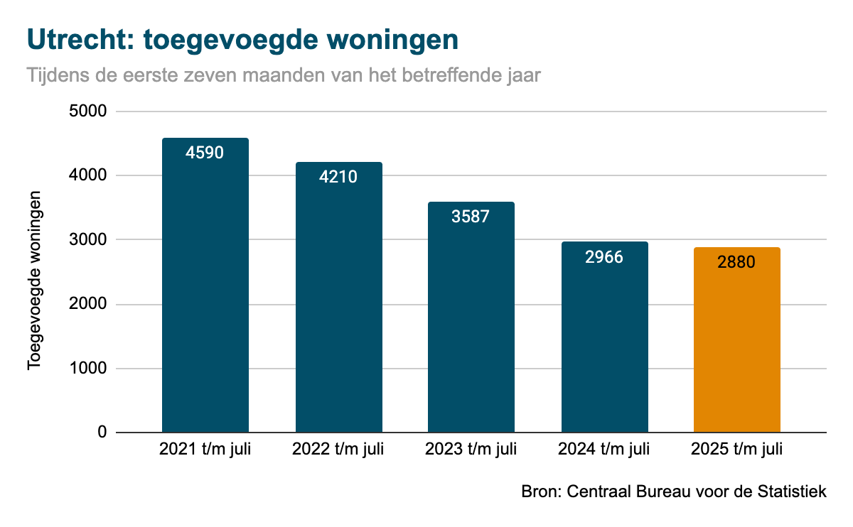 In Utrecht zijn er in 2025 tot en met de maand juli 2.880 woningen aan de woningvoorraad toegevoegd. De woningvoorraad steeg daarmee met 0,46% van 620.064 woningen op 1 januari naar 622.944 woningen op 31 juli. Dit is een daling van 3% ten opzichte van 2024, toen er in dezelfde periode nog 2.966 woningen aan de woningvoorraad waren toegevoegd.