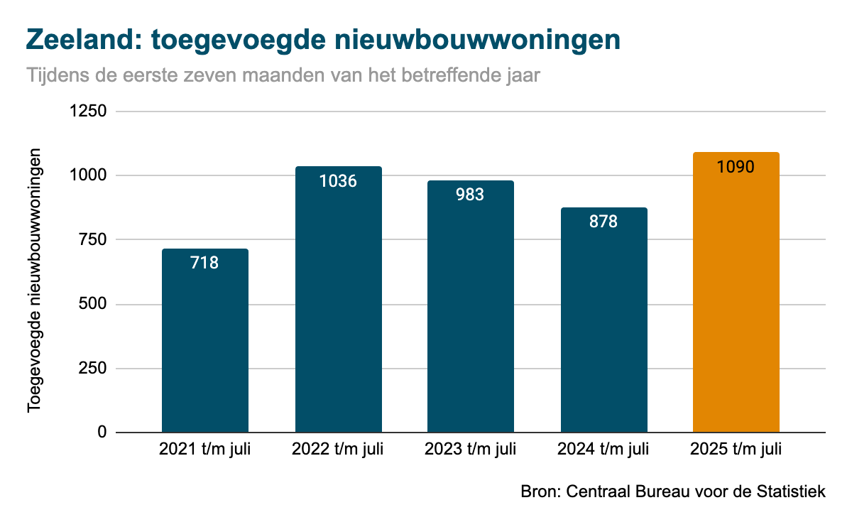 Zoals gebruikelijk in Nederland is de toename van de woningvoorraad in Zeeland vooral te danken aan het aantal toegevoegde nieuwbouwwoningen. In de eerste zeven maanden van 2025 zijn er 1.090 nieuwbouwwoningen aan de voorraad toegevoegd. Dit is een stijging van 24% ten opzichte van 2024, toen er in dezelfde periode slechts 878 nieuwbouwwoningen aan de woningvoorraad waren toegevoegd.