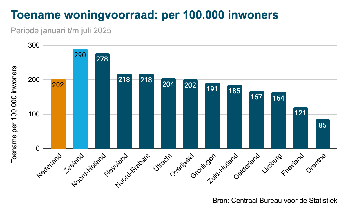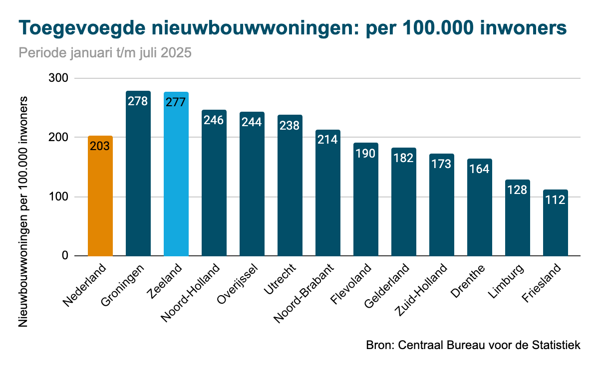 Het aantal nieuwbouwwoningen dat er in Zeeland aan de woningvoorraad is toegevoegd, ligt met 277 nieuwbouwwoningen per 100.000 inwoners 37% hoger dan gemiddeld in Nederland. Alleen in de provincie Groningen zijn er net iets meer nieuwbouwwoningen per 100.000 inwoners aan de woningvoorraad toegevoegd.