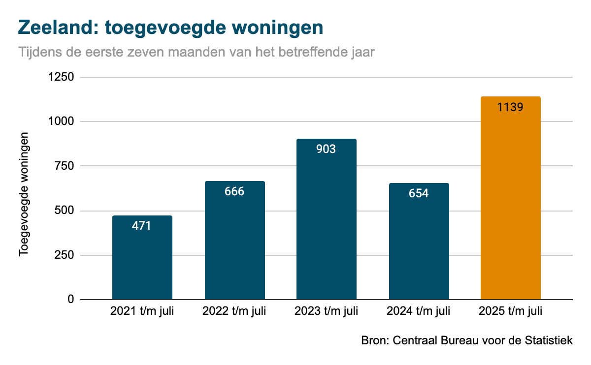 In Zeeland zijn er in 2025 tot en met de maand juli 1.139 woningen aan de woningvoorraad toegevoegd. De woningvoorraad steeg daarmee met 0,59% van 193.454 woningen op 1 januari naar 194.593 woningen op 31 juli. Dit is een stijging van maar liefst 74% ten opzichte van 2024, toen er in dezelfde periode slechts 654 woningen aan de woningvoorraad waren toegevoegd.