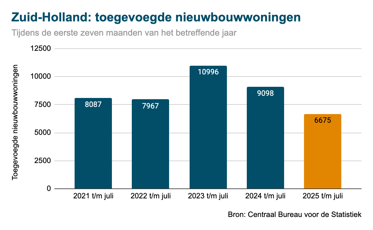 Zoals gebruikelijk in Nederland is de toename van de woningvoorraad in Zuid-Holland vooral te danken aan het aantal toegevoegde nieuwbouwwoningen. In de eerste zeven maanden van 2025 zijn er 6.675 nieuwbouwwoningen aan de voorraad toegevoegd. Dit is een daling van 27% ten opzichte van 2024, toen er in dezelfde periode nog 9.098 nieuwbouwwoningen aan de woningvoorraad waren toegevoegd.