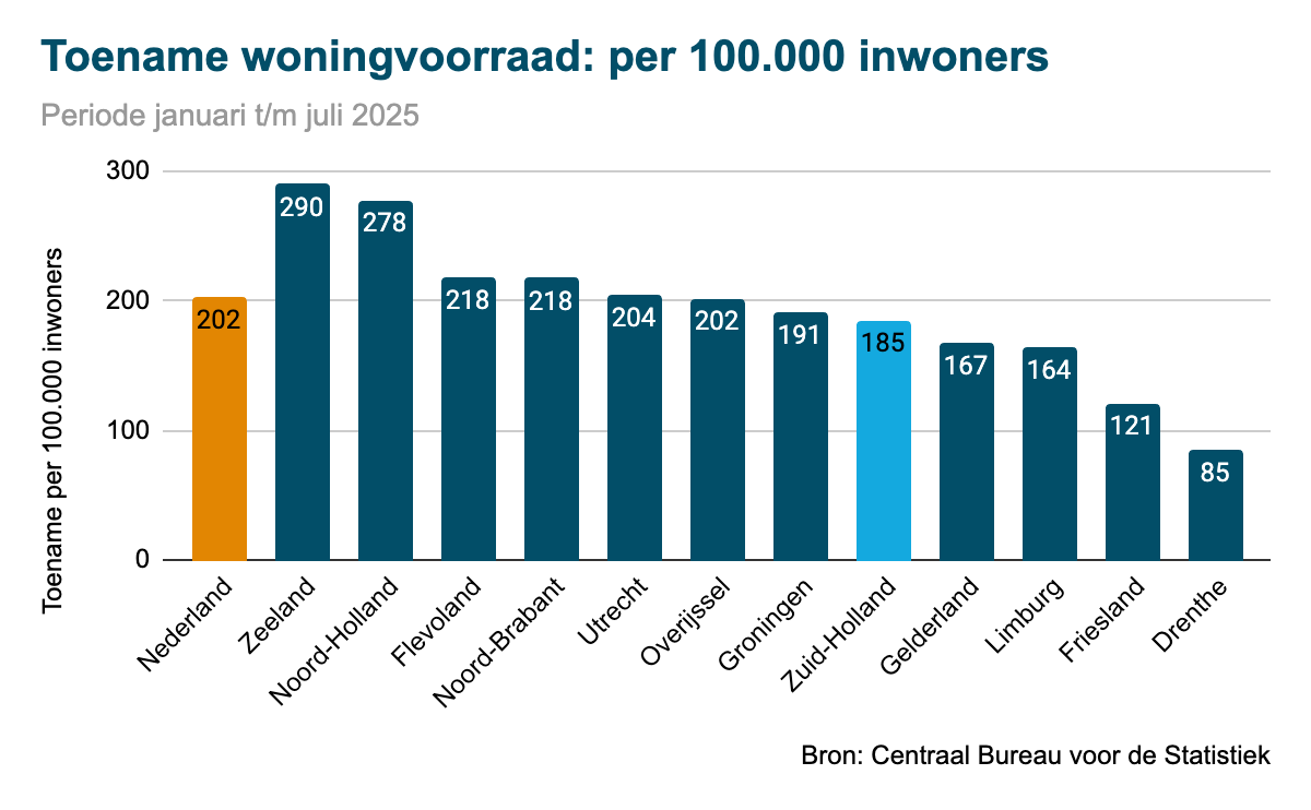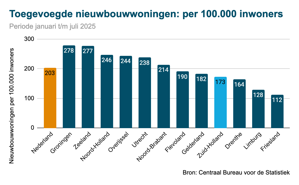 Het aantal nieuwbouwwoningen dat er in Zuid-Holland aan de woningvoorraad is toegevoegd, ligt met 173 nieuwbouwwoningen per 100.000 inwoners 15% lager dan gemiddeld in Nederland. Alleen in de provincies Drenthe, Limburg en Friesland zijn er minder nieuwbouwwoningen per 100.000 inwoners aan de woningvoorraad toegevoegd.
